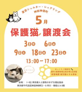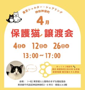 4月は3日間開催いたします。 神保町にある保護猫シェルター「東京シェルター・シェアリング神田神保町」にて、 4月も保護猫譲渡会を開催いたします🐾 新しい季節がはじまり、街の景色が少しずつやわら […]